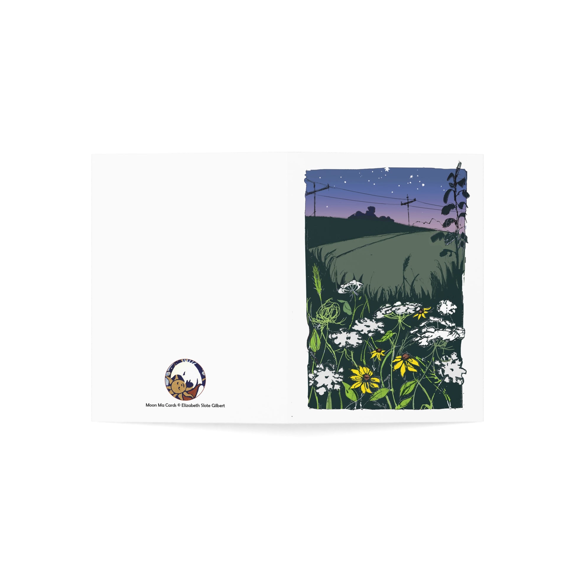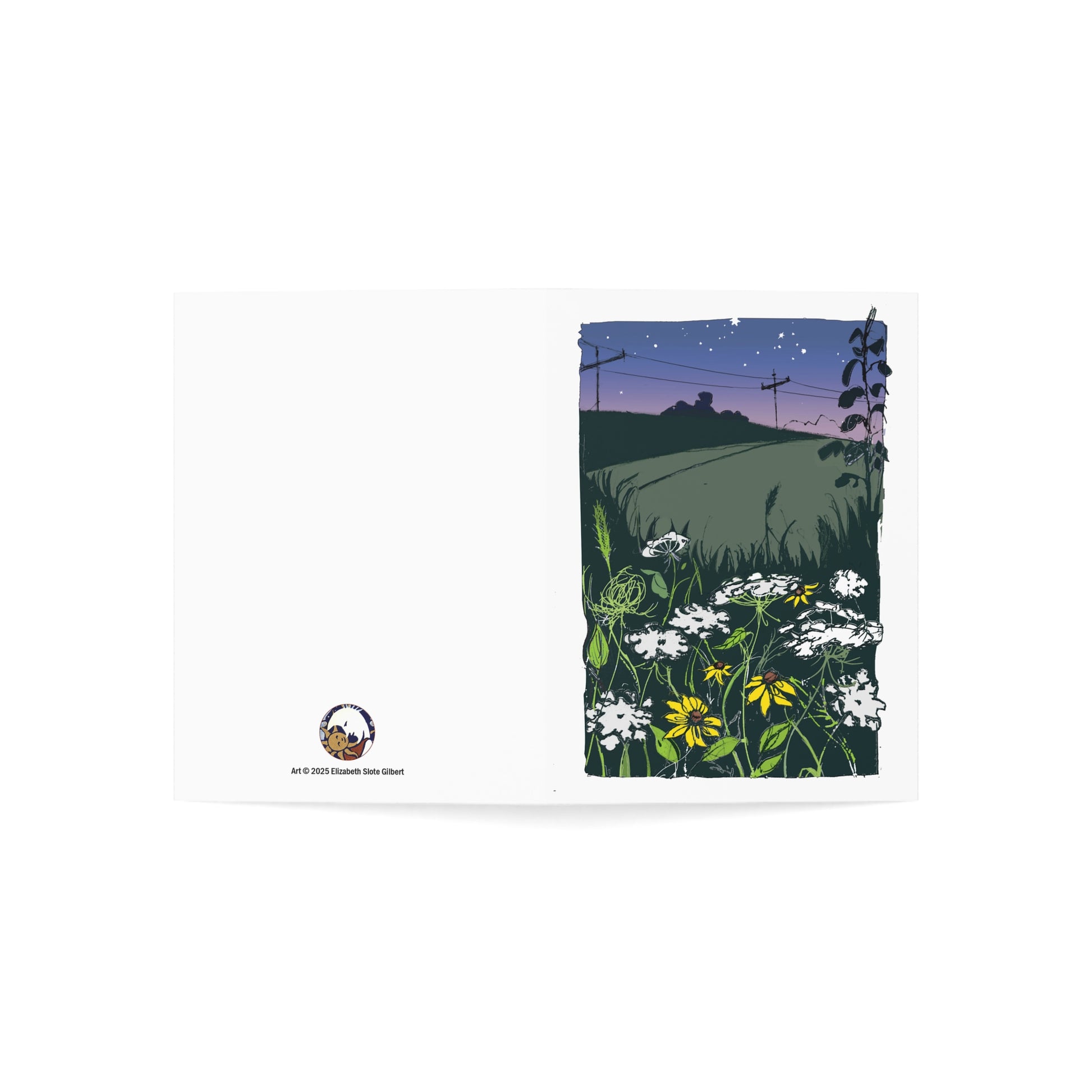 Capture the beauty of a summer night with these vibrant and high-quality greeting cards featuring a farm field with wildflowers, just after sunset. Perfect for sending warm wishes and heartfelt messages to friends and family, these cards are ideal for any occasion throughout the year.