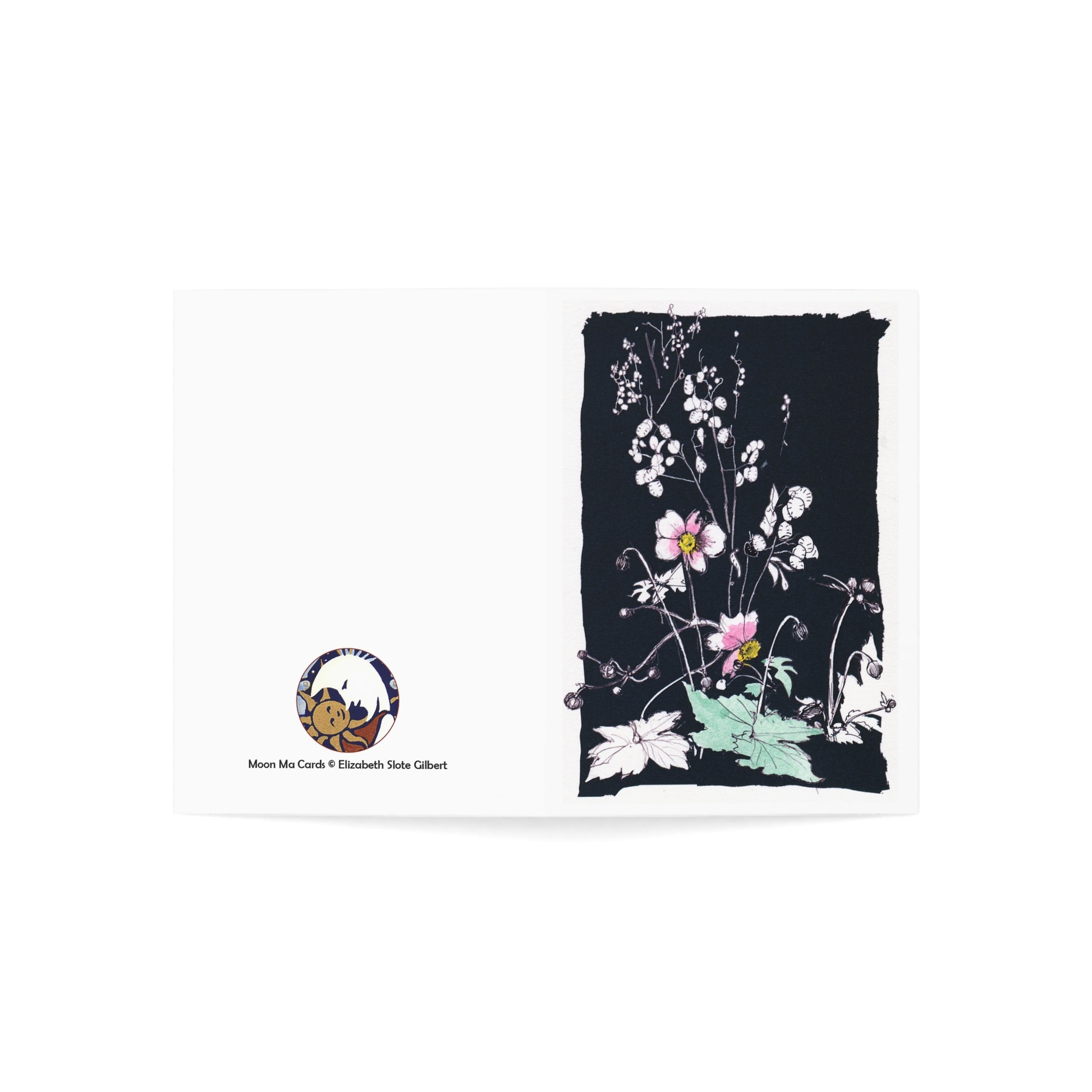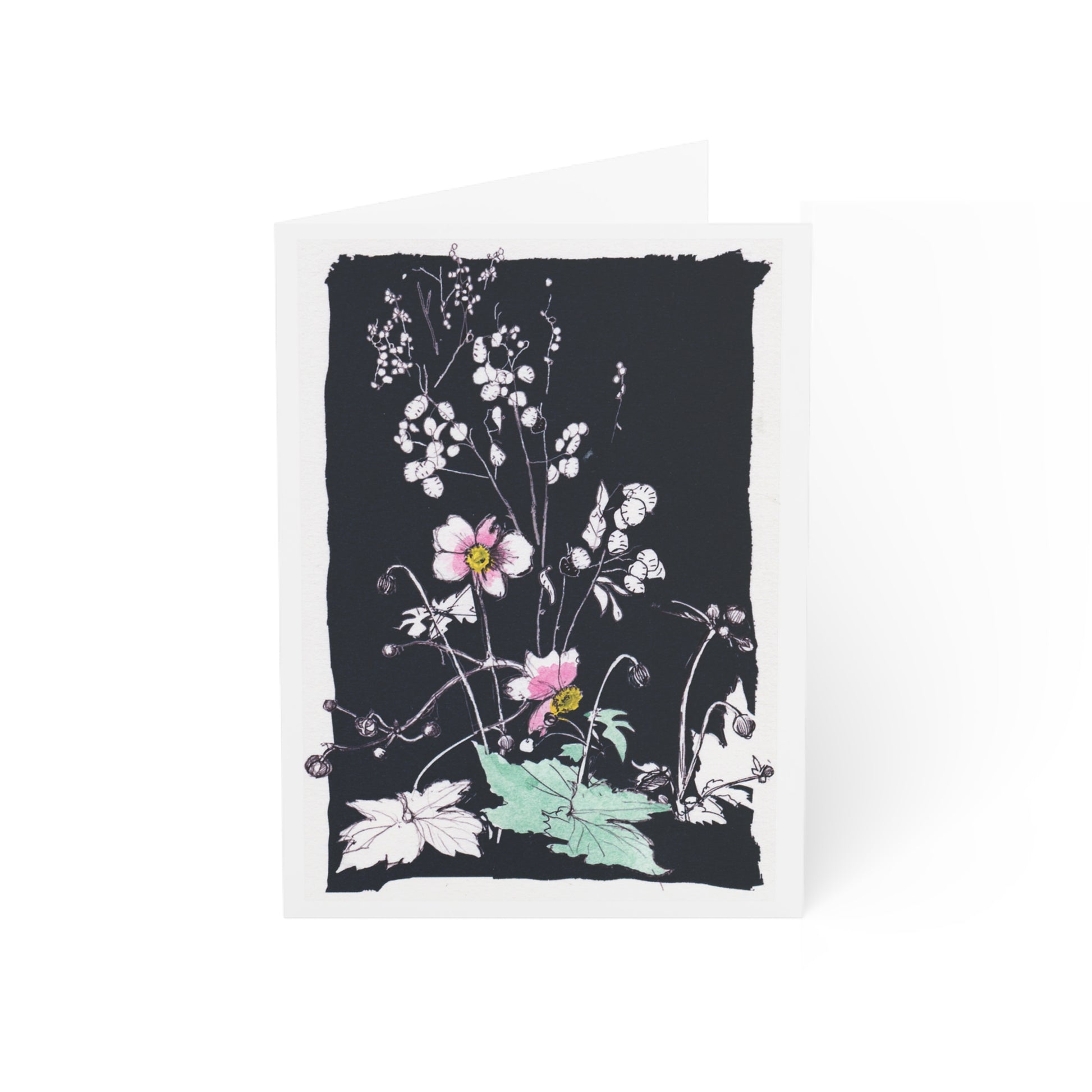 Original art showing anemones and money plants glowing against a dark background. These vibrant greeting cards are perfect for sending heartfelt messages to your loved ones. Ideal for those who appreciate unique and artistic designs, these cards are suitable for various occasions such as birthdays, anniversaries, and thank you notes.