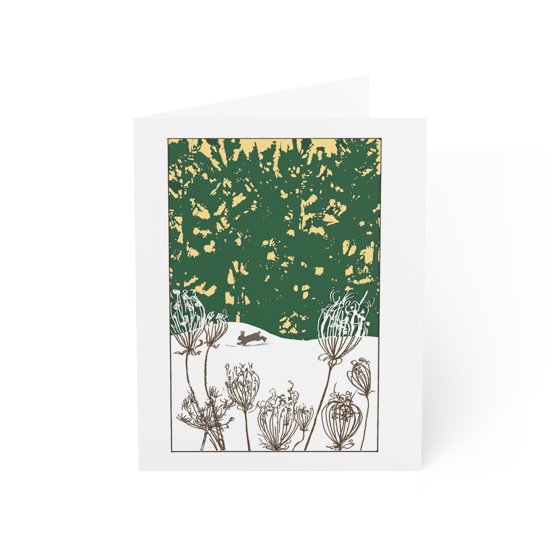 These winter-themed greeting cards feature a cozy sunrise behind pine trees and a playful rabbit in the snow. Perfect for sending warm wishes during the holiday season or any special occasion. Ideal for those who appreciate nature and charming illustrations.
