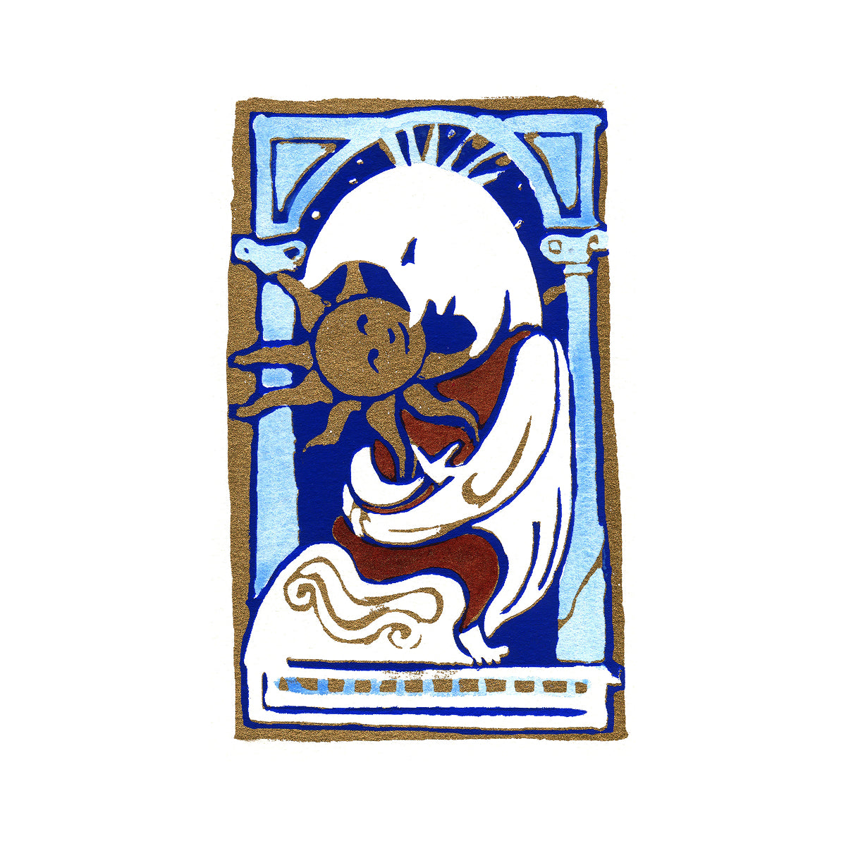Whimsical picture of the moon holding the sun in her lap. Original glue-stencil silkscreen, digitized.