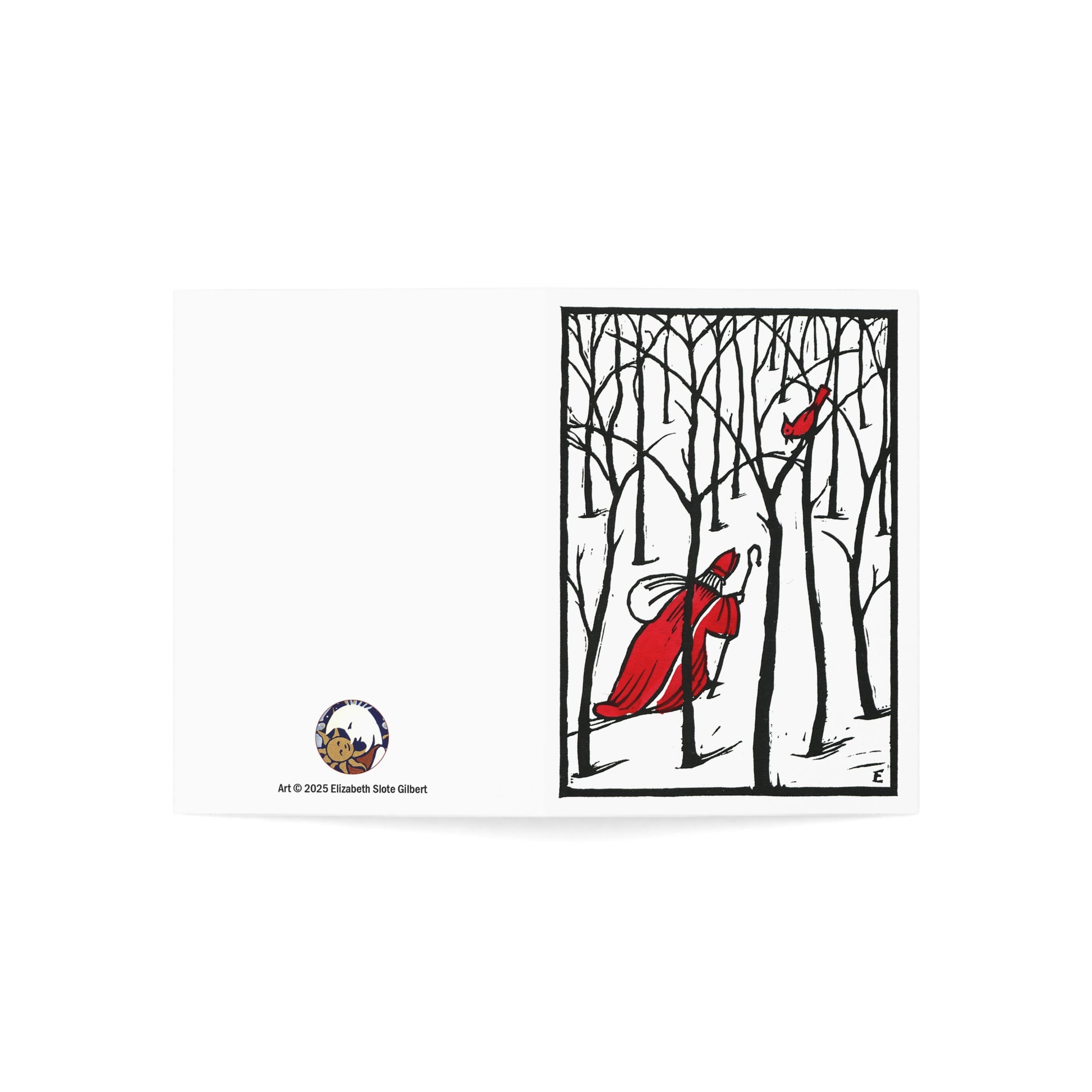 Charming block print art featuring Father Christmas in the snowy woods, accompanied by a cardinal. Perfect for sending holiday greetings to friends and family, adding a touch of festive cheer to their day. Ideal for those who appreciate traditional holiday themes.